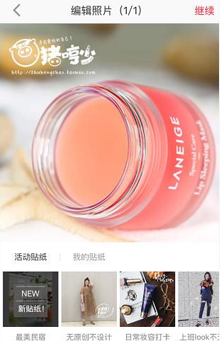 2.选择要发布的产品图片进行编辑,添加滤镜、标签、贴纸等。到产品;
