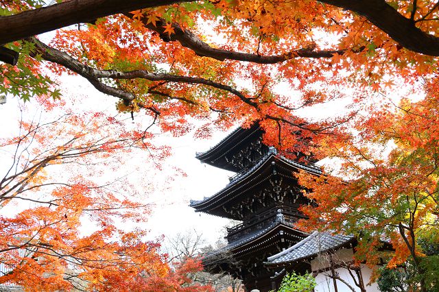 真如堂信阳堂位于坡顶,是一个欣赏红叶的好地方,人相对较少。秋天的颜色从主厅的前面开始,一直到后面,到了深秋,树叶像鲜红的地毯一样铺在主厅的后面。三层楼高的佛塔使寺庙。