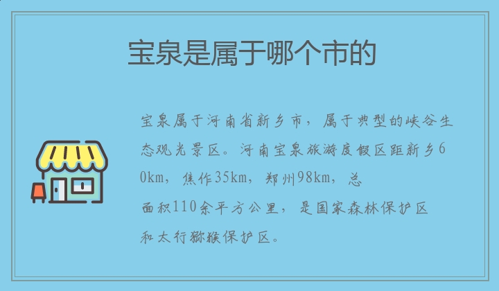 宝泉属于河南省新乡市,属于典型的峡谷生态观光景区。河南宝泉旅游度假区距新乡60km,焦作35km,郑州98km,总面积110余平方公里,是国家森林保护区和太行猕猴保护区。