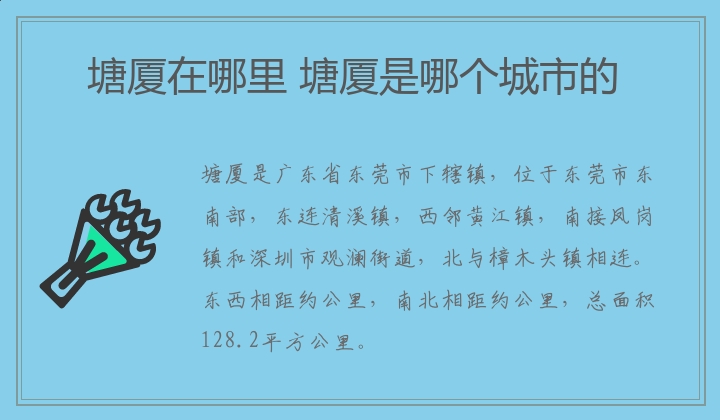 塘厦是广东省东莞市下辖镇,位于东莞市东南部,东连清溪镇,西邻黄江镇,南接凤岗镇和深圳市观澜街道,北与樟木头镇相连。东西相距约公里,南北相距约公里,总面积128.2平方公里。