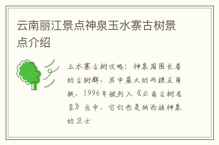 玉水寨古树攻略:神泉周围长着的古树群,其中最大的两棵五角枫,1996年被列入《云南古树名录》当中。它们也是纳西族神泉的卫士,严禁在树上攀爬,要是有人犯忌,他将受到大。