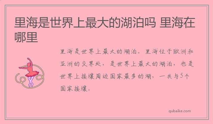 里海是世界上最大的湖泊。里海位于欧洲和亚洲的交界处,是世界上最大的湖泊,也是世界上接壤周边国家最多的湖,一共与5个国家接壤。