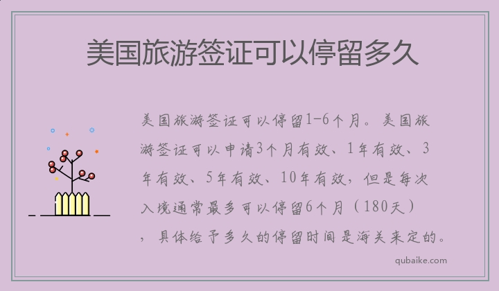 美国旅游签证可以停留1-6个月。美国旅游签证可以申请3个月有效、1年有效、3年有效、5年有效、10年有效,但是每次入境通常最多可以停留6个月(180天),具体给予多久的停留时间是海关来定的。