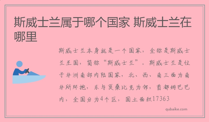 斯威士兰本身就是一个国家,全称是斯威士兰王国,简称“斯威士兰”。斯威士兰是位于非洲南部内陆国家,北、西、南三面为南非所环抱,东与莫桑比克为邻,首都姆巴巴内,全国分为4个区,国土面积17363平方公里。