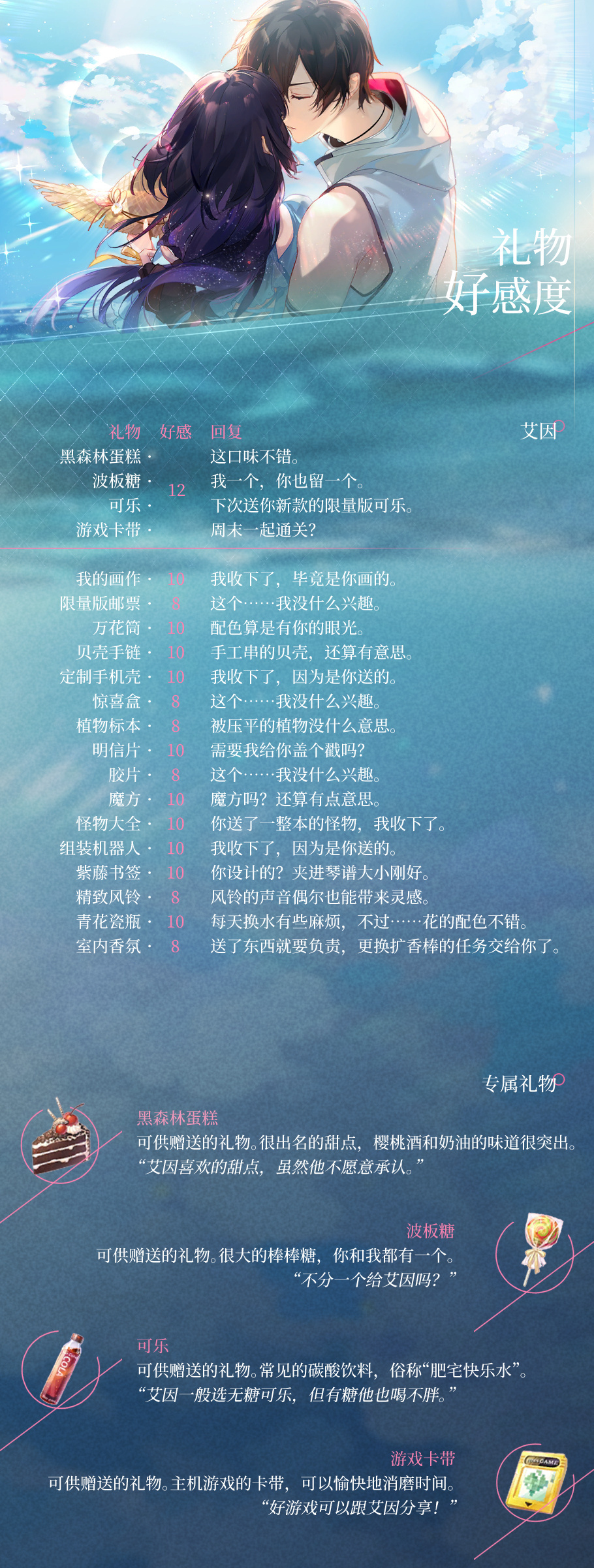 时空中的绘旅人艾因有哪些好感度礼物?时空中的绘旅人艾因好感度礼物回复汇总。「我一个,你也留一个。下次送你新款的限量款可乐」黑森林蛋糕,波板糖,可乐,游戏卡带是提升艾因好感度的不二之选哦!喜欢你,爱着你。
