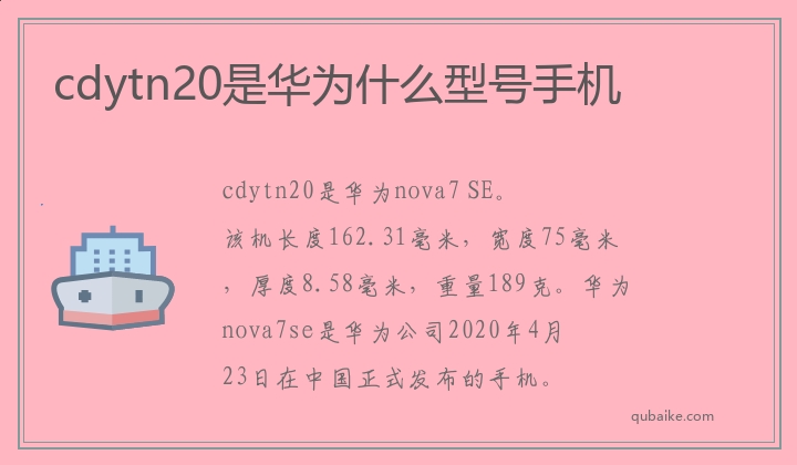 cdytn20是华为nova7 SE。该机长度162.31毫米,宽度75毫米,厚度8.58毫米,重量189克。华为nova7se是华为公司2020年4月23日在中国正式发布的手机。