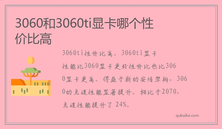3060ti性价比高。3060ti显卡性能比3060显卡更好性价比也比3060显卡更高。得益于新的安培架构,3060的光追性能显著提升。相比于2070,光追性能提升了 24%。