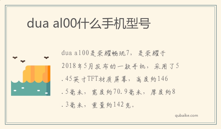 dua al00是荣耀畅玩7,是荣耀于2018年5月发布的一款手机,采用了5.45英寸TFT材质屏幕,高度约146.5毫米,宽度约70.9毫米,厚度约8.3毫米,重量约142克。