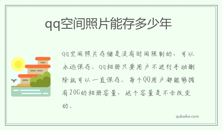 qq空间照片存储是没有时间限制的,可以永远保存。qq相册只要用户不进行手动删除就可以一直保存。每个QQ用户都能够拥有20G的相册容量,这个容量是不会改变的。