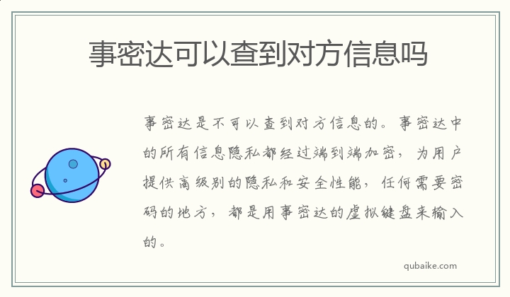 事密达是不可以查到对方信息的。事密达中的所有信息隐私都经过端到端加密,为用户提供高级别的隐私和安全性能,任何需要密码的地方,都是用事密达的虚拟键盘来输入的。