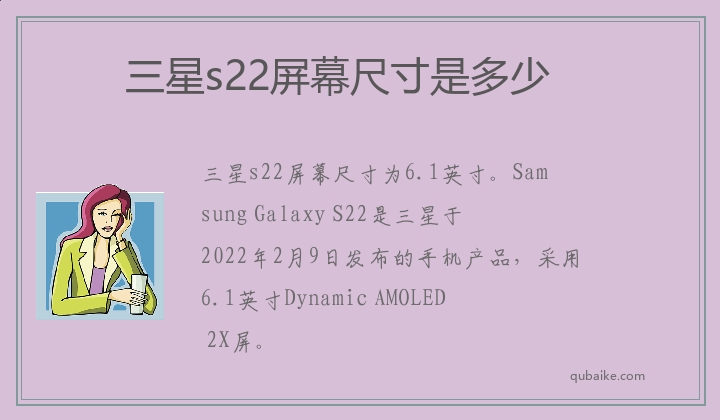 三星s22屏幕尺寸为6.1英寸。Samsung Galaxy S22是三星于2022年2月9日发布的手机产品,采用6.1英寸Dynamic AMOLED 2X屏。