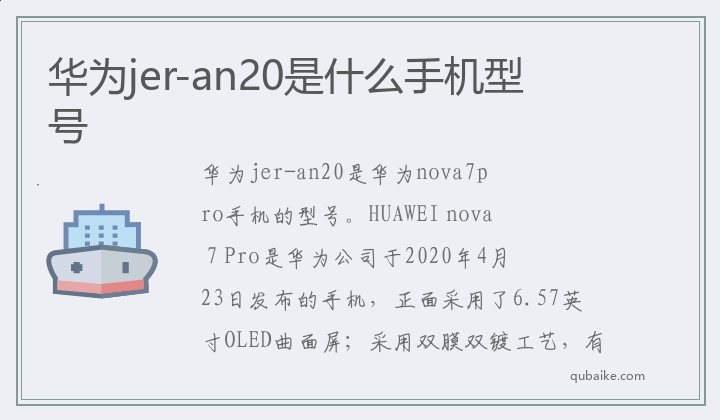 华为jer-an20是华为nova7pro手机的型号。HUAWEI nova 7 Pro是华为公司于2020年4月23日发布的手机,正面采用了6.57英寸OLED曲面屏;采用双膜双镀工艺,有7号色。