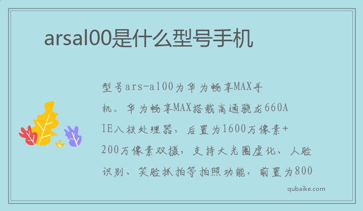 型号ars-al00为华为畅享MAX手机。华为畅享MAX搭载高通骁龙660AIE八核处理器,后置为1600万像素+200万像素双摄,支持大光圈虚化、人脸识别、笑脸抓拍等拍照功能,前置为800万像素摄像头
