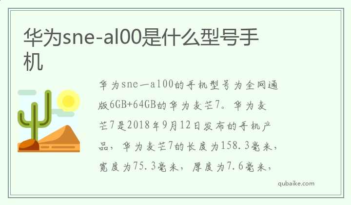 华为sne一al00的手机型号为全网通版6GB+64GB的华为麦芒7。华为麦芒7是2018年9月12日发布的手机产品,华为麦芒7的长度为158.3毫米,宽度为75.3毫米,厚度为7.6毫米,屏幕6.3英
