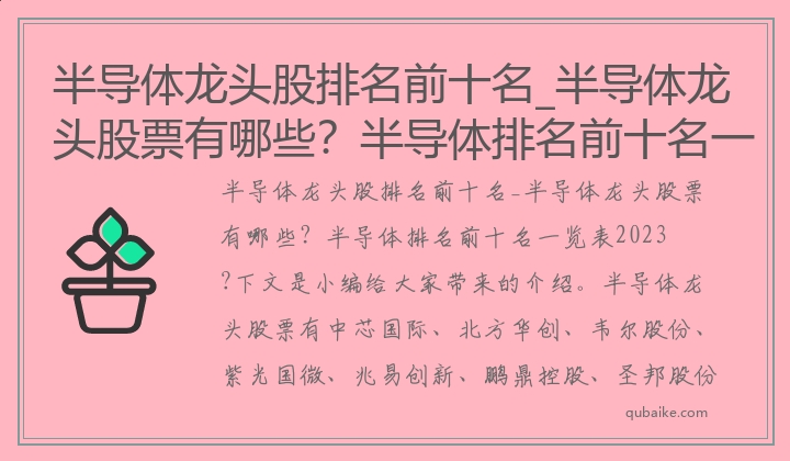 半导体龙头股排名前十名_半导体龙头股票有哪些?半导体排名前十名一览表2023?下文是小编给大家带来的介绍。半导体龙头股票有中芯国际、北方华创、韦尔股份、紫光国微、兆易创新、鹏鼎控股、圣邦股份、士兰微、深