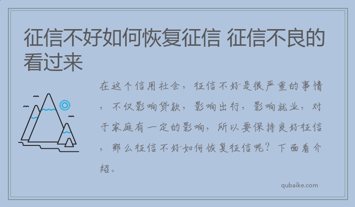 在这个信用社会,征信不好是很严重的事情,不仅影响贷款,影响出行,影响就业,对于家庭有一定的影响,所以要保持良好征信,那么征信不好如何恢复征信呢?下面看介绍。