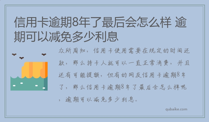 众所周知,信用卡使用需要在规定的时间还款,那么持卡人就可以一直正常消费,并且还有可能提额,但有的网友信用卡逾期8年了,那么信用卡逾期8年了最后会怎么样呢,逾期可以减免多少利息。