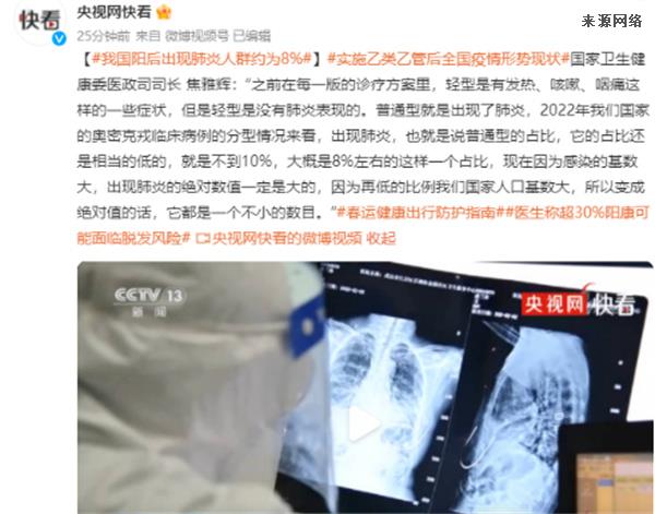 国家卫健委我国阳后出现肺炎人群约为8%