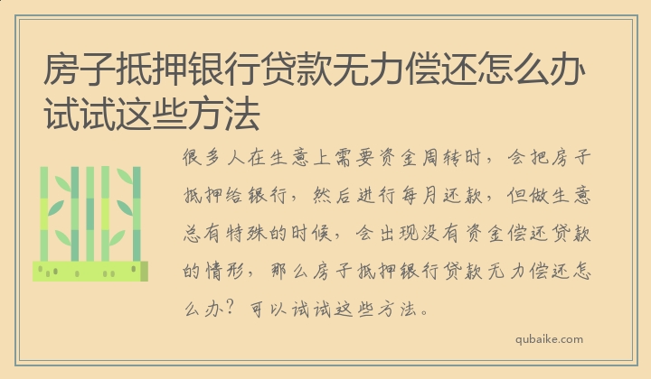 很多人在生意上需要资金周转时,会把房子抵押给银行,然后进行每月还款,但做生意总有特殊的时候,会出现没有资金偿还贷款的情形,那么房子抵押银行贷款无力偿还怎么办?可以试试这些方法。