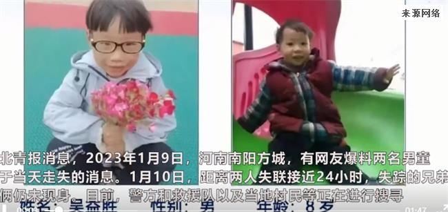 网友在1月10日爆料,河南南阳方城有两名男童在1月9日走失,警方和当地的村民进行找寻,结果已经过去24个小时了,目前还没有找到。