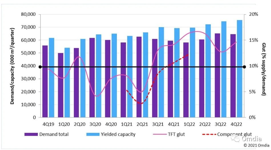 由于担心2021年下半年需求下降,面板厂商急于在2021年第二季度推出尽可能多的产品,而且他们仍然可以利用新冠疫情驱动的需求和高价格。这将拉动2021年下半年的需求。电视面板平均尺寸也将继续增加,在2019年和2022年之间,LCD和OLED电视平均尺寸预计将从45.6英寸增加到50.2英寸。