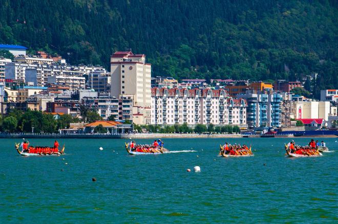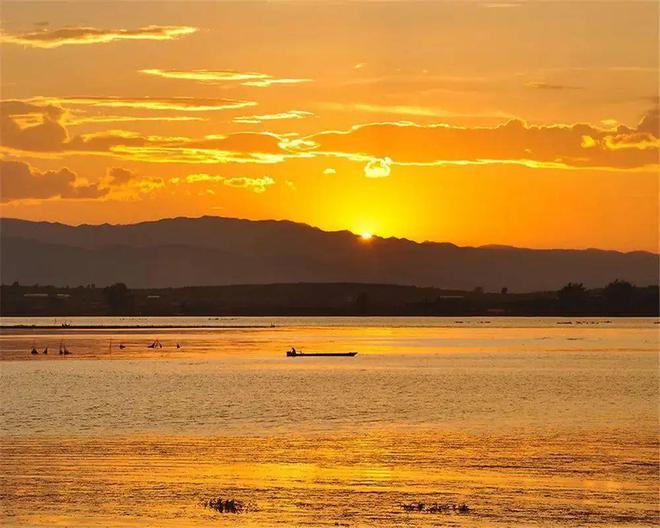 该湖为断陷淡水湖,其中产海菜,鱼肥美。美丽的湖泊,湖面平静,偶尔有几艘船在湖面上泛起涟漪。