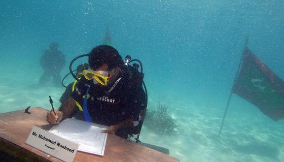 是的,你没听错。2009年,马尔代夫总统穆罕默德-纳希德在海床上组织了所有内阁部长的会议,以便提高人们对世界海洋所面临的危险以及人类如何干预淡水资源的认识。