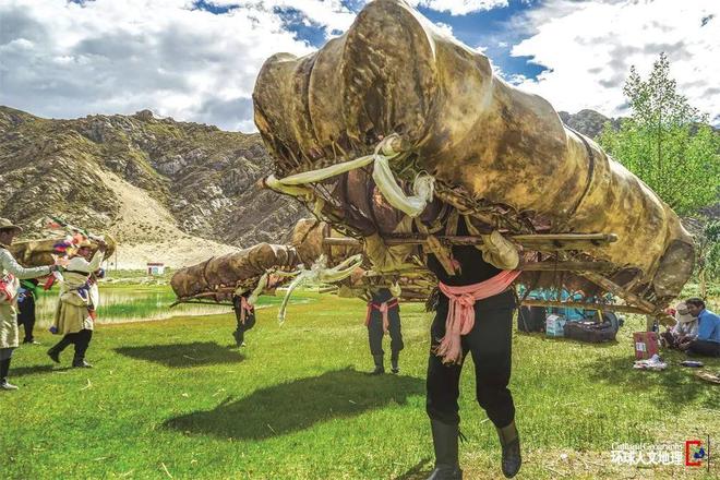 随着领舞人的歌声响起,舞船者背船起舞。领舞人手持一根道具木棍,木棍上拴一条哈达。舞船的人身背牛皮船,扮演一对野牛,雌牛称“巴登马松杰布”,意为吉祥天母,雄牛称“达姆青曲吉杰布”,意思是阎魔护法神。