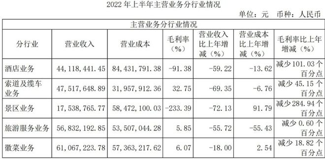 这个数量的游客远远不足以弥补景区的营业收入,黄山旅游2022年上半年财报显示,亏损最严重的两个板块是景区业务与酒店业务,景区业务的毛利率为-233.39%,酒店业务的毛利率则为-91.38%,高毛利业务索道及缆车毛利率亦下降了45.15%。