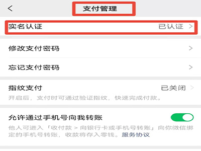 3、进入支付管理页面,点击“实名认证”选项。