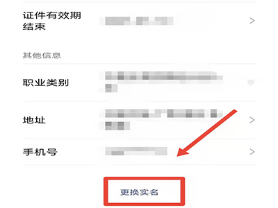 4、在个人信息界面,点击底部的“更换实名”。