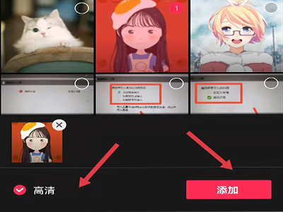 2、勾选照片,点击左下角的“高清”,点击右下角的“添加”。