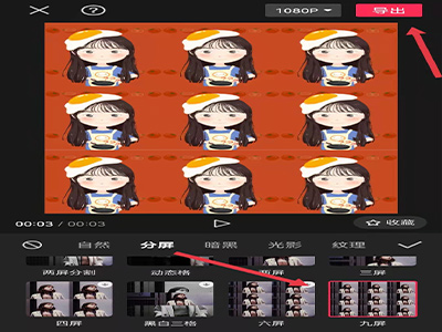 5、点击“九屏”,选择“九屏”,即可将一人变为九人,再点击右上角的“导出”进行保存。