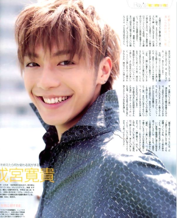 成宫宽贵是当前大受欢迎的个性派新秀,活跃于影视两个领域,在年轻女孩子中很有口碑。成宫出生在东京,而双亲是冲绳人。他幼年坎坷,自小父母离异,初中时母亲又撒手人寰,此后和弟弟一起由外婆照顾。学生时代的成宫并不是一个爱念书的乖孩子,经常旷课逃学。2000年,成宫走上了演艺之路。他过关斩将在试镜选拔中脱颖而出,成为话剧《残存人类、爱之本质》的主演之一。这出充满后现代味道的戏是著名剧作家BradFraser的作品,由日本著名舞台导演宫本亚门执导,在当时很受关注。此前并无表演经验的成宫以其出色的表现获得了好评。此后,成宫的星路走得顺风顺水。次年,他出演《溺水的鱼》初登大银幕。02年,由于J-PHONE广告和《极道鲜师》里那个暗恋英语老师的男生,成宫的知名度迅速飙升。接着,03版《高校教师》里的邪恶牛郎、《少女杀手阿墨》里惊鸿一瞥的杀手令成宫的演技获得了进一步肯定,粉丝群的规模也逐日壮大。04年,他获得了主演电影的机会,在改编自同名漫画的奇幻《下弦之月》中和栗山千明演对手戏。这些年来,成宫每年都有不少新作问世,他拥有独特的气质,戏路却不拘泥一格,《娜娜》系列中憨直的吉他手、电视剧版《蜂蜜与四叶草》中不羁的美大学生、《爱无罪》中心事重重的彷徨者、电视片《无法守护》中的变态狂人、《六宅一生》中的边缘青年……每一个角色都展现出保有本真但有所不同的成宫宽贵。值得一提的是,他还曾经为动画电影《翡翠森林-狼与羊》中那只胖乎乎的小羊咩咩配音,展现出难得的柔弱的一面。