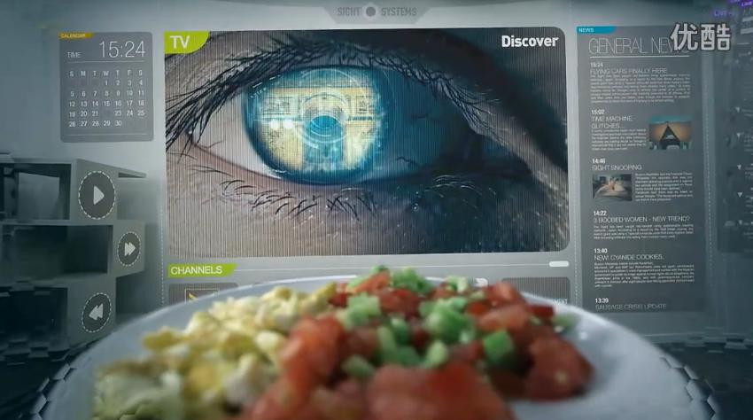 未来世界,一款名为“Sight”的隐形眼镜,让男主人公的生活变得智能有趣。体感游戏只需趴在毯子上就可以身临其境,打开冰箱就能看见所有食物的详细信息,做饭切菜更是像闯关游戏一般轻松好玩,甚至它可以为你选择今晚约会的衣服搭配。
