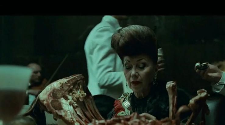 在一间光线不甚明朗的房间内,长长的餐桌上摆放着极度奢华的美味盛宴,衣着考究的客人低头埋首,大快朵颐,风卷残云一般销蚀着桌上的美食。这些客人有的身穿军装,有的如同贵族,有的似乎是宗教领袖,无一例外的是每个人身上都满是灰尘,好像刚刚经历着一场莫大的灾难。食物一盘盘端了上来,盘子上满是动物血淋淋的尸体和内脏。客人们宛如饕餮无度的饿鬼,旁若无人地不断进食。就在此时,地板突然断裂,客人连同餐桌跌落到下一层。服务人员们淡定自若地迁到下一层,简单打扫后宴会继续。