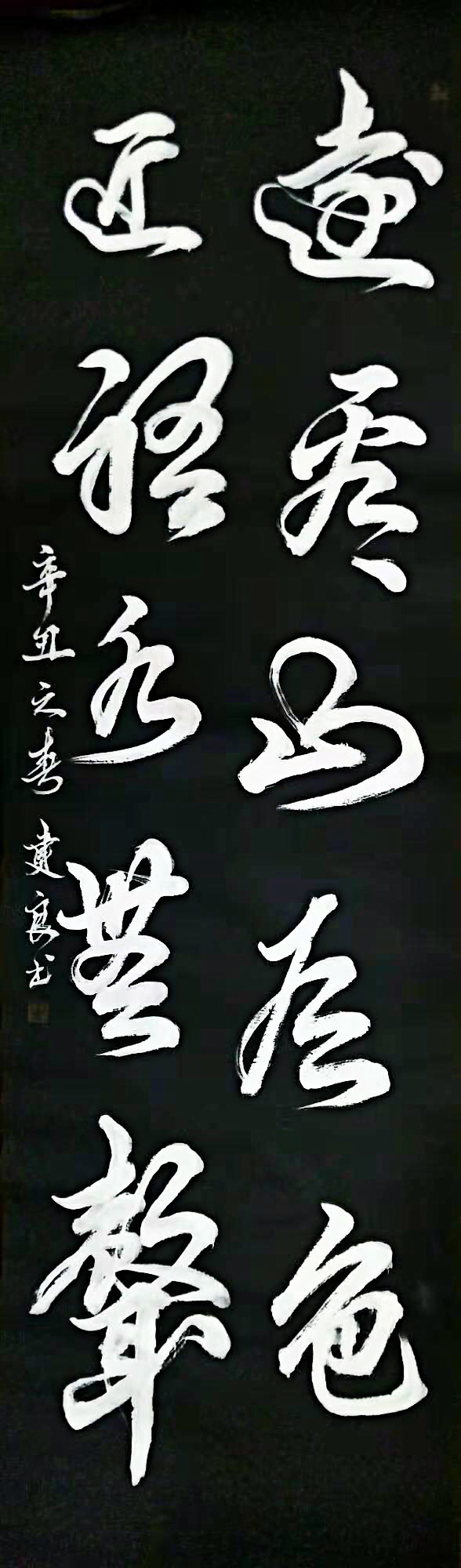 在书法艺术生涯,时常磨砺剑三刻,苦心竭力,墨轩伴纸书写静,势如破竹字里行。以墨香书客为伴,炫舞笔仙作锋范。