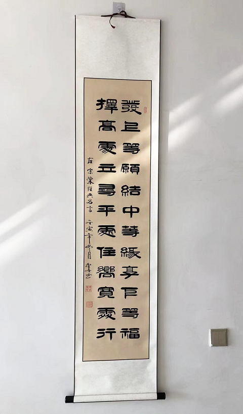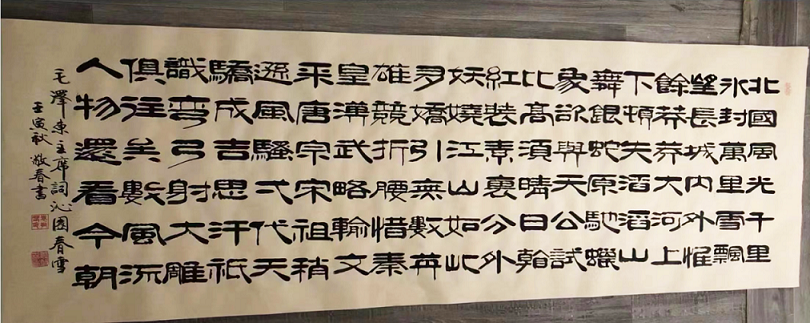 袁敬春先生自幼酷爱书法,主攻隶书,不失古法,勤学苦练,临池不辍,刻苦钻研,在坚实的传统功力基础上,充分发挥了自己的创造性,用现代的审美意识并加上文学素养,形成了鲜明的个人风格,打下了扎实的传统功力,经过多年的练习和揣摩,形成了自己独有的隶书艺术风格,更别具收藏艺术韵味。袁敬春先生认为在艺术观上坚守民族传统的阵地,但又不墨守古人的陈规,并在继承的基础上力求具有新的发展,创作的艺术作品一定要“尊重民族的欣赏习惯”。当然不排斥一切进步和优秀的外国艺术,而且应当认真钻研、吸收、融化和发展古今中外具有民族风格和时代特色的完美的艺术样式。艺术家则是把更多、更好的艺术作品奉献给自己的国家和所处的时代,当艺术作品达到一定的品位时,会带来它的副产品,即经济效益,但这永远是副产品,不能主次颠倒,否则艺术家本人和其作品就会一同贬值。作品笔力遒劲厚重,笔画粗细相称,结体平稳严谨。一丝不苟,均称慎密,墨酣意足,字字工整,闲适文雅,钢润峻拔,苍劲有力,浑厚潇洒,行笔流畅自然,清刚明俊,可谓形神皆备。袁敬春先生经过多年的磨炼,行成了自己独特的书法艺术风格,代表作品《沁园春雪》、《春夏秋冬》、《茶道》、《养得泽福》、《念奴娇.赤壁怀古》、《善缘》、《陋室铭》等等被多家媒体转载刊登,其榜书书法作品更是多次在全国展会上展出并获得各种奖项并被国内外众多书法爱好者和收藏家广泛收藏,被业界一致公认为具有收藏价值的书法艺术家。2013年被中国艺术品评估鉴定委员会评为8000元\平方尺。
