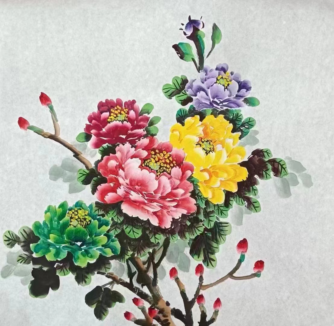 2015年春节前夕慰问国旗护卫队,赠送作品两幅。作品《盛世中华》牡丹图被悬挂在天安门城楼。