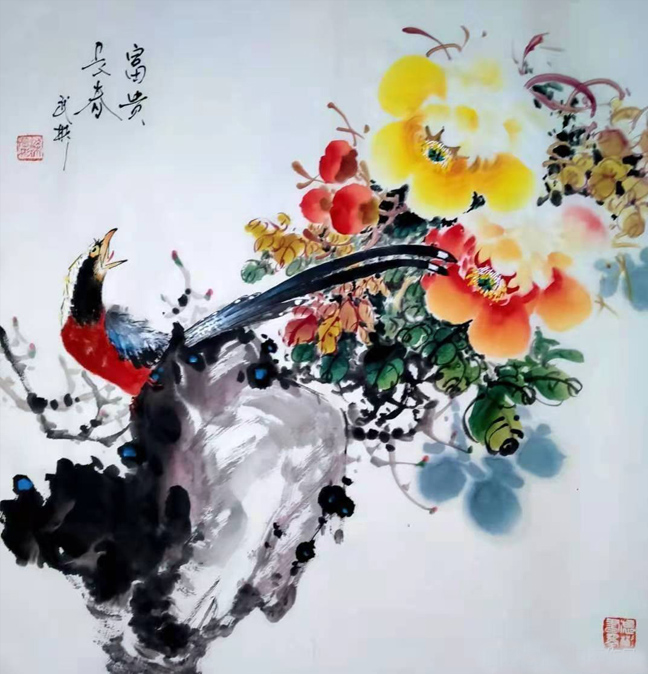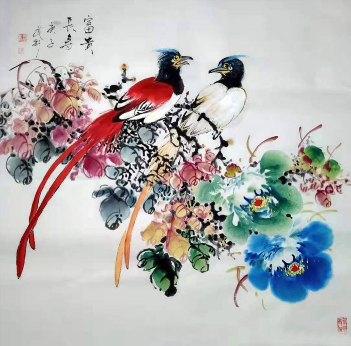 2017富贵呈祥 荣获首届中原书画精品展金奖,2018年河南电视台《文武决》书画大赛冠军,荣获2019年全国两会重 点推荐《人民艺术家》荣誉称号,作品《富贵有余》,荣获2019年首届当代艺术奖全国书画大赛金奖,《鸟语花香》荣获2020年第二届金鼎艺术奖全国书画大赛金奖,2020年捐赠的国画作品〈鸟语花香〉被中国国家博物馆收藏。新乡电视台拍摄专题片梁武彬画牡丹,出版有《梁武彬花鸟画集》《梁武彬牡丹画集》,《建国70周年画集》被《中国邮册》收录并出版,央视著名书画评论家史峰为梁武彬撰写《艳而不俗尚品韵,画如其人真君子》高度评价梁武彬的大写意花鸟画。