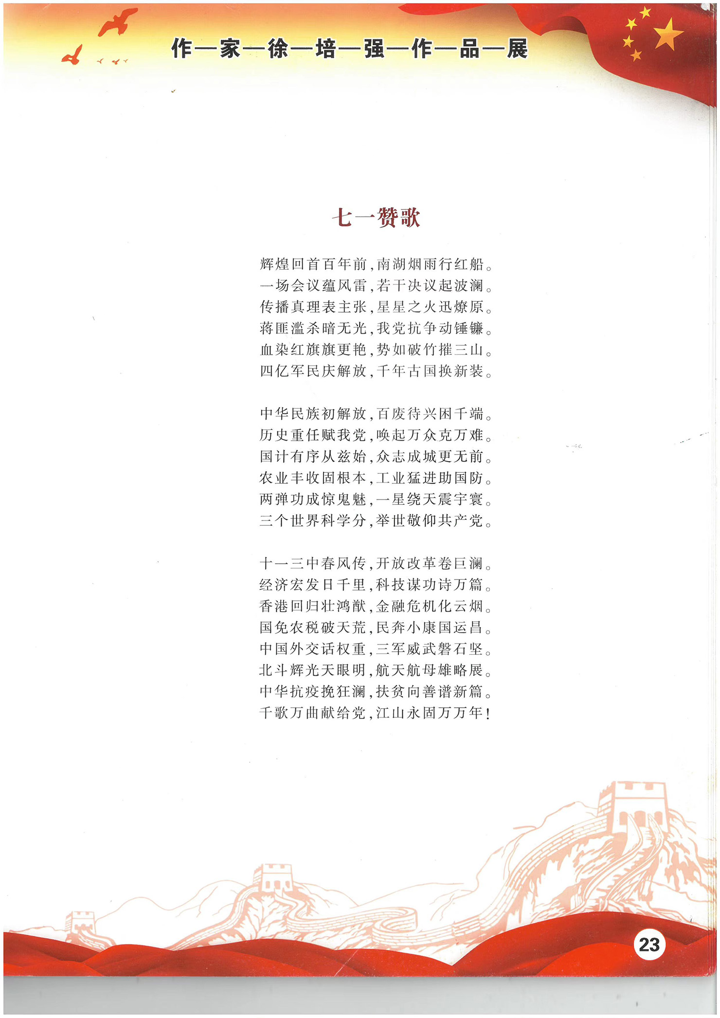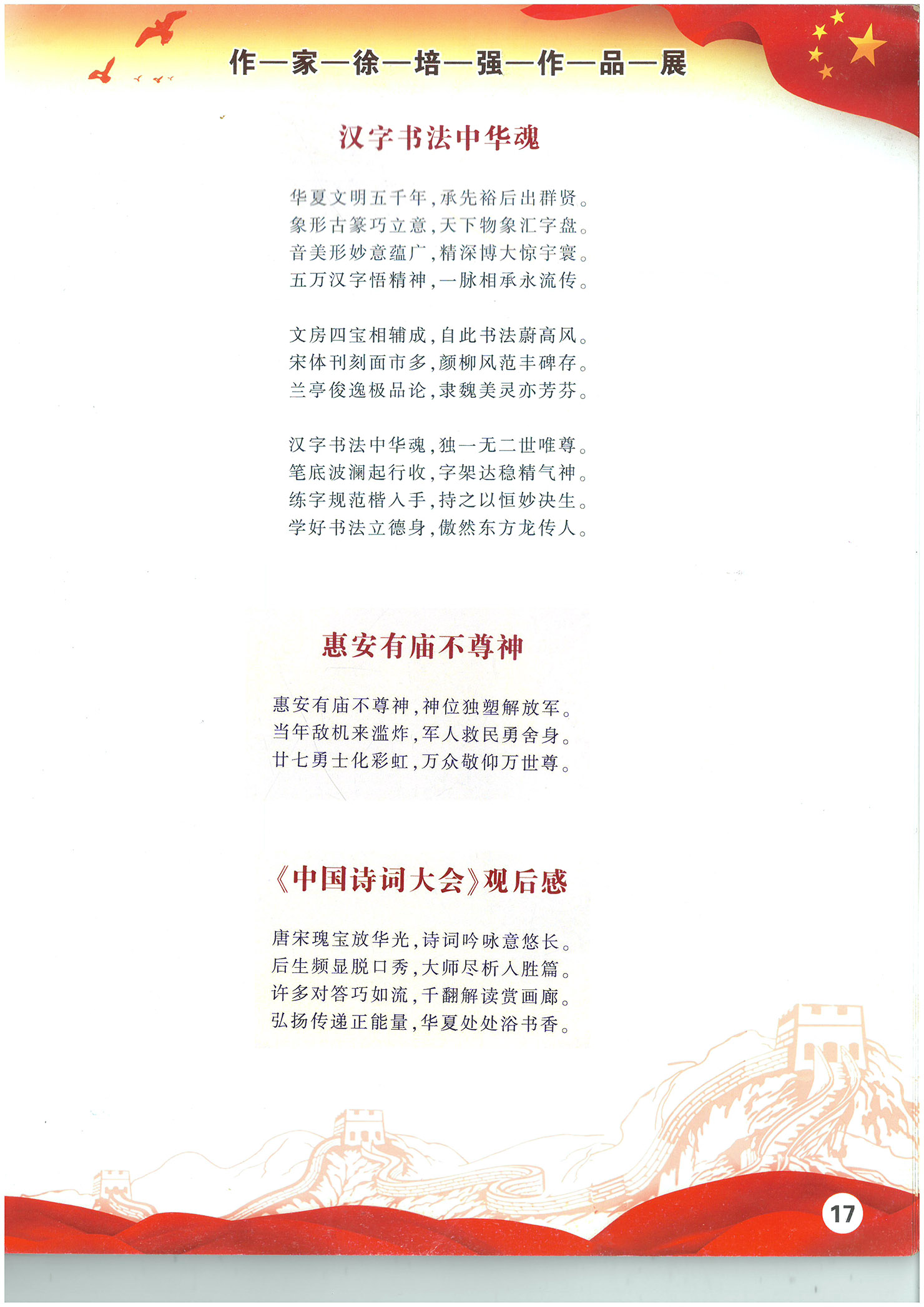 2009年国庆60周年,诗作品入选《爱国文典》同时被授予“中国改革开放三十周年诗词终身荣誉奖”:在香港回归十周年和党建 90周年《党魂耀中华》征文中诗作品均获得一等奖。