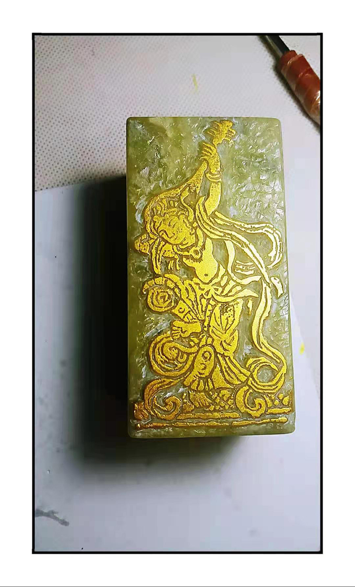 丁玮玮,号净心,1973年人,毕业于重庆川美。重庆人,籍贯达州市。重庆飞凌装修公司首席设计师,达州戛云印社理事。热爱中华传统文化,擅长工笔画,纂刻,掐丝景泰蓝画,平时空闲时爱好听戏曲弹古琴游古镇,享受与古交心的碰撞。现主要致力于将敦煌题材创作于金石之上,希望让敦煌壁画进入方寸之间,却并不束缚在方寸之地。