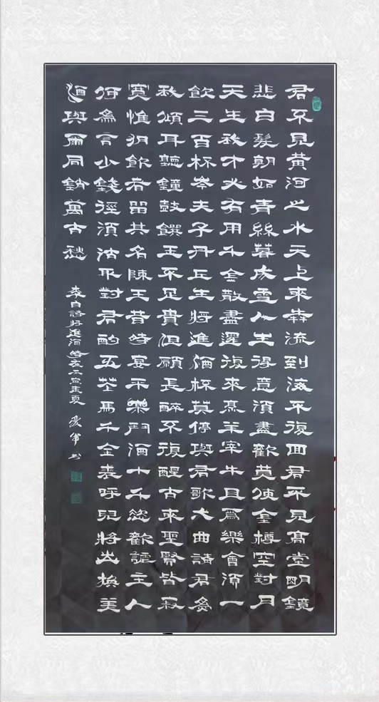 自幼酷爱书法,擅长隶书。师从曹琦、曾华,刻苦钻研。隶书造诣颇深,乙瑛碑 曹全碑等范本,更是爱不释手反复临帖。从而,达到精湛艺术的升华。他的隶书大小相近,粗细,疏密富有变化,特别是个别飞白和廋笔,既有《曹全碑》的特点又有飘逸奇宕的新意。