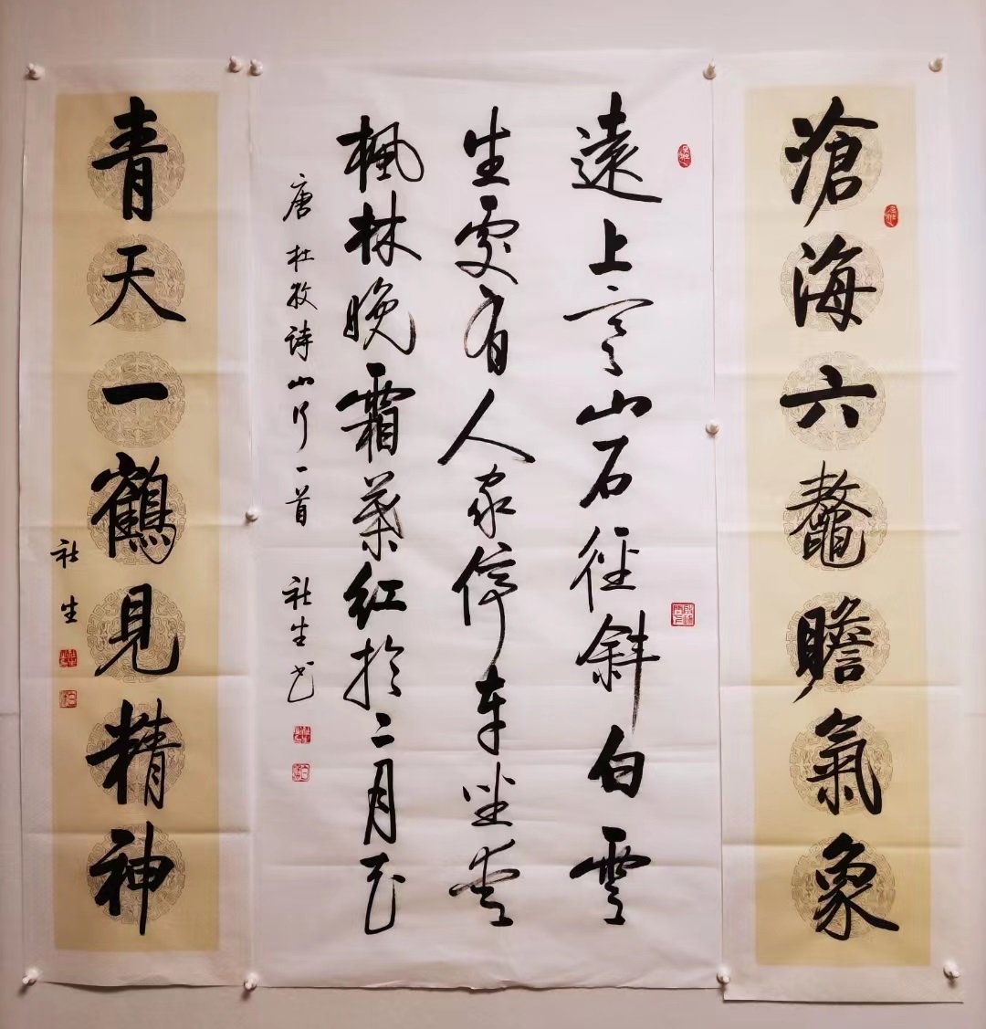 社生书法推崇古法,力主创新;不薄古人,不厚今人,继承古今书法百家之长又融合启功体、毛体等体书法的新时代特色,逐步形成个人的既不失传统古法又具备新时代特色的新体书风。尤其继承了启体清雅而脱俗,淡泊而雄浑,厚重而苍劲,平和而中正的传统文人书风的书卷气,又汲取毛体雄浑壮丽、天马行空的豪迈霸气,特别是毛体狂草的大倾斜写法,即左倾和右倾,加上启体中正写法而逐步形成了自己一种形式上以行楷草三结合的富有音乐动感,笔法上以左倾右倾中正三相结合的波浪式新体书风。