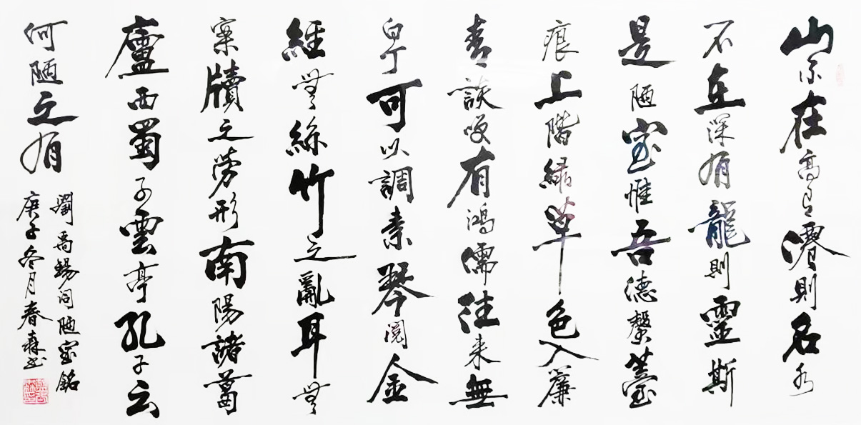 其作品榜书字体混厚不失灵动,行书流畅秀气,意境高远,独具一格,法度严谨,自然得体,笔势遒劲,气韵高古,奔放潇洒。