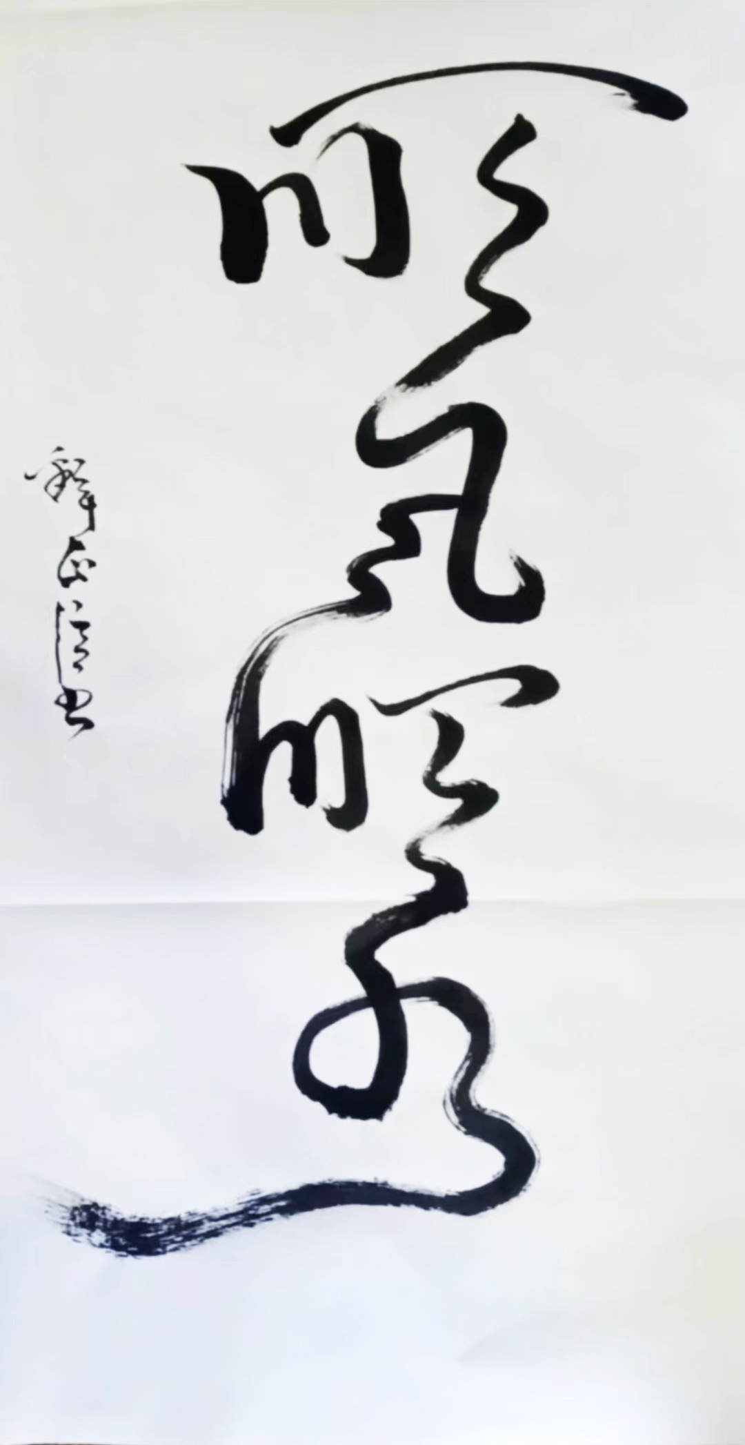 观正信法师书法,其色,其形,其浓淡枯湿,其断连辗转,粗细藏露皆变数无穷,气象万千。丝毫不受束缚,甚至整行一笔而下,有如神仙般的纵逸,来去无踪。观其力而不失,身姿展而不夸,笔迹流水行云。落笔如云烟。观之若脱缰骏马腾空而来绝尘而去;又如蛟龙飞天流转腾挪,来自空无,又归于虚旷,这近乎癫狂的原始的生命力的冲动中包孕了天地乾坤的`灵气。