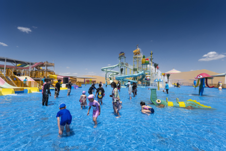 在沙漠中各种深浅的大型泳池里,以各种泳姿释放自己——在沙丘起伏无际的沙漠里——在沙漠中属于自己的水的世界里……累了,就躺在清爽的沙滩床上,美美地过上几个小时,同时可以与同行的人边吃边喝边聊哦,别睡着了,演出一定会有的,悦沙岛每天会有十多场不同的演出或比赛,是艺术的、是体育的……
