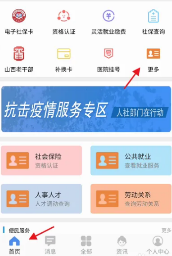 填写完成,进入民生山西APP首页,点击上方的更多进入