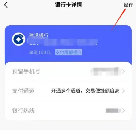 在银行卡详情页面,点击右上角的操作;