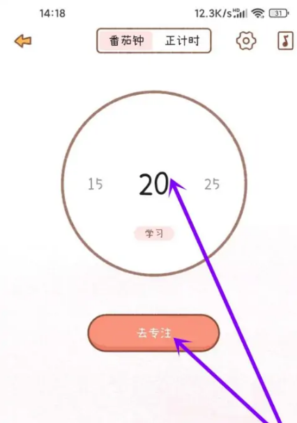 进入番茄钟界面,选择倒计时间,点击“去专注”按钮。
